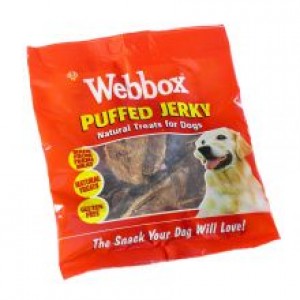 Webbox Puffed Jerky is a light crispy snack for your dog. It can be fed at any time as a treat or reward. Webbox Puffed Jerky is free of artificial additives, preservative and colourings. INGREDIENTS: Dried Meat. TYPICAL ANALYSIS: Protein: 76% Oil: 10%